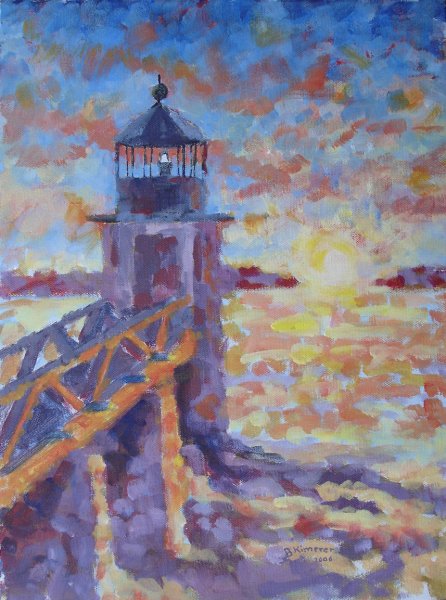 This is my attempt at doing a very loose treatment of a sunset at the Marshall Point Lighthouse in Port Clyde Maine. I wanted to do a painting with very bright colors and an impressionistic style.