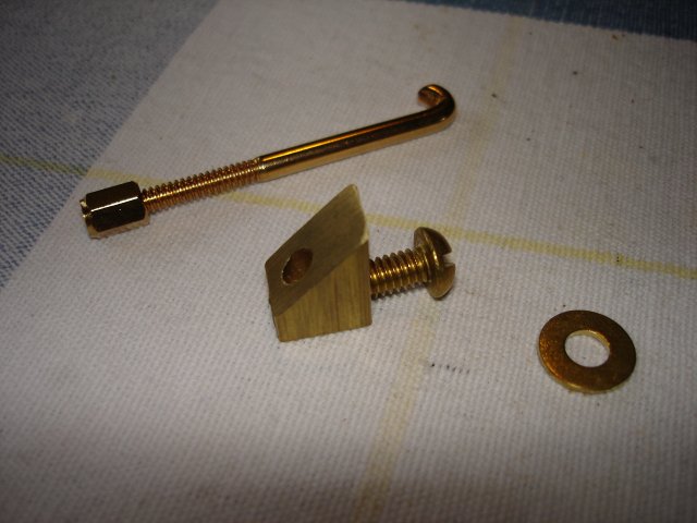 It looks like the shoes are made from some rectangular brass stock which has been cut at an angle and then drilled and tapped for the screw. All of the hardware supplied with this kit is uncoated solid brass. It is shiny now, but it will all eventually darken to an antique patina.