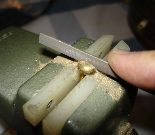 I put the screw into my small vise and started filing a notch. Fortunately, the brass is soft so I was able to make good progress.