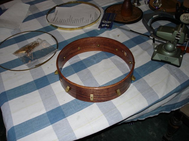 Finally the finish is dry enough that I can mount the shoes on the pot. The shoes on this banjo are a clever little contrivance. Here is a photo of the hardware: