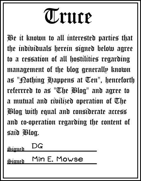 DG and I have decided to call a halt to the conflict about who is running this blog. We have decided that we will be co-contributors to the blog. Hence, we have signed a truce.